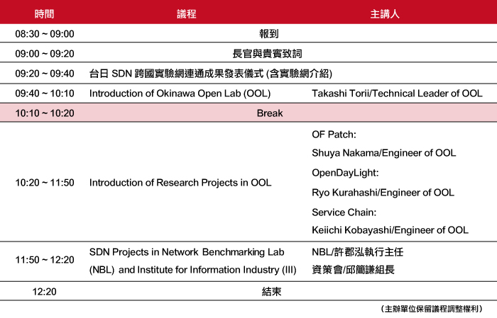 軟體定義網路 (Software-Defined Networking,SDN) 是目前網路架構演進的新興主流,將為網通產業帶來重大的變革,對於我國主要以ODM/OEM為主的網通產業而言,如何掌握SDN的契機,帶動業者升級,是非常重要的課題;有鑑於此,國立交通大學網路測試中心 (Network Benchmarking Lab,NBL)、 資策會與日本「沖繩開放實驗室」(Okinawa Open Laboratory,OOL) 合作,建置SDN跨國實驗網路,為我國網通廠商提供測試服務。為了向各界介紹台日SDN跨國實驗網路的建置成果,NBL與資策會於8月10日假台北市TAF空總創新基地舉辦「2015台日SDN國際交流會」,邀請日本沖繩開放實驗室專家來台,與各界分享日本SDN研發成果與開發經驗,精彩可期,歡迎踴躍報名參加。