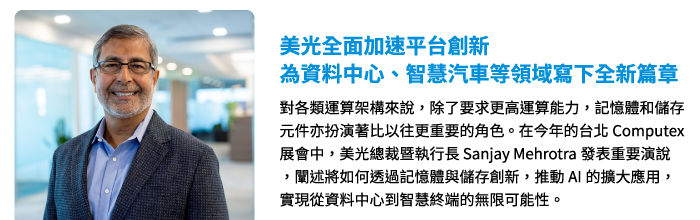 AI與5G匯聚帶動的數位革命,使數據成為驅動經濟發展的關鍵要素。因此,對各類運算架構來說,除了要求更高算力,記憶體和儲存元件亦扮演著比以往更重要的角色。在今年的Computex展會中,美光科技發表了一系列基於其領先176 層 NAND 和 1α DRAM 製程技術的新產品;同時美光執行長 Sanjay Mehrotra及運算與網路業務部門資深副總裁Raj Hazra亦發表演說,闡述將如何透過記憶體與儲存革新,推動AI的擴大應用,以實現從資料中心到智慧終端的無限可能性⋯⋯