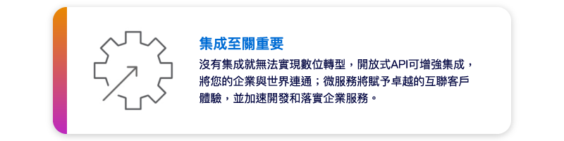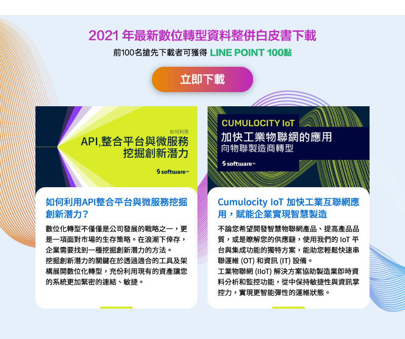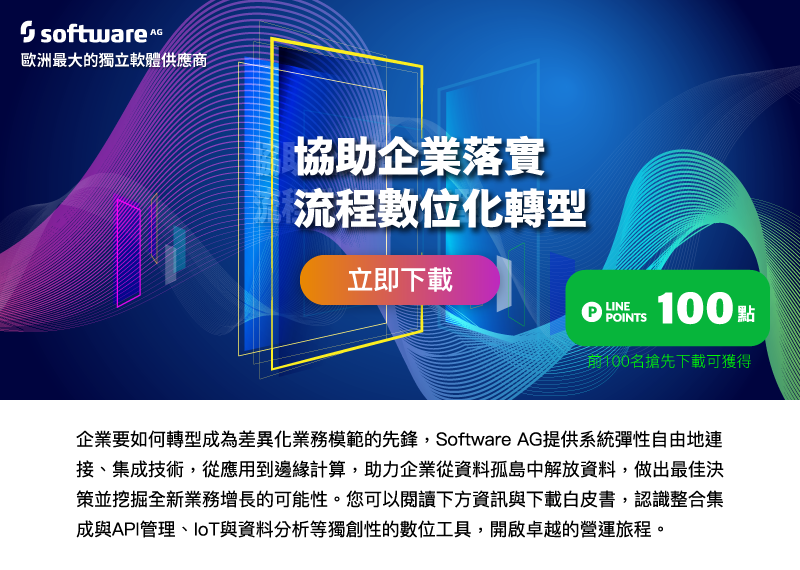 企業要如何轉型成為差異化業務模範的先鋒,Software AG提供系統彈性自由地連接、集成技術,從應用到邊緣計算,助力企業從資料孤島中解放資料,做出最佳決策並挖掘全新業務增長的可能性。您可以閱讀下方資訊與下載白皮書,認識整合集成與API管理、IoT與資料分析等獨創性的數位工具,開啟卓越的營運旅程。