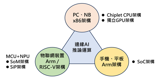 邊緣AI推論運算應用產品朝三大方向發展,一為x86架構的PC與NB、二為Arm架構的手機與平板、三為Arm/ RISC-V架構的物聯網裝置。