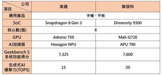 手機與平板AI推論運算方面,高通於2023年10月24日發布Snapdragon 8 Gen 3晶片,以SoC架構整合GPU Adreno 750與AI加速器Hexagon NPU,運算力達15 TOPS,功能可支援LLM、大型視覺模型(Large Vision Model;LVM) 、 語音辨識(Automatic Speech Recognition;ASR)。另外,聯發科於2023年11月6日發布Dimensity 9300晶片,相同以SoC架構整合GPU Mali-G720與AI加速器APU 790,運算力達20 TOPS,可支援130億個參數LLM(最高支援330億個),另外,文字生成圖像部分,可使用穩定擴散(stable diffusion)與低秩適應(Low-Rank Adaptation;LoRA)模型生成GIF格式的圖像。