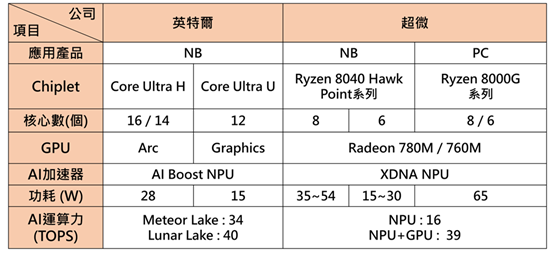 NB與PC的AI推論運算方面,英特爾於2023年12月14日發布Core Ultra系列晶片,以Chiplet架構整合Arc/ Graphics GPU與AI Boost NPU加速器,可提高AI推論工作效率,同時可於邊緣裝置進行AI推論運算,並保持隱私與資料安全,而運算力部分,Meteor Lake架構達34 TOPS;2024年底英特爾將推出Lunar Lake架構,運算力可提升至40 TOPS。另外,超微同時間發布NB專用Ryzen 8040 Hawk Point系列與PC專用Ryzen 8000G系列晶片(2024年1月31日上市),整合GPU (Radeon 780M/ 760M)與XDNA NPU加速器,單獨NPU運算力達16 TOPS,總和運算力達39 TOPS。