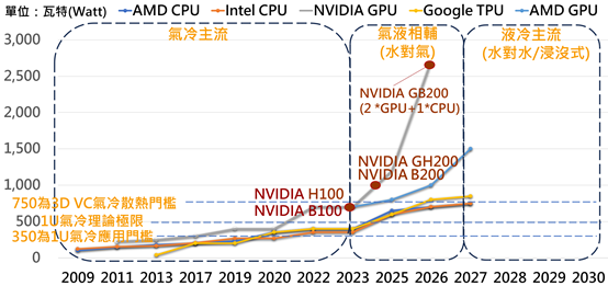 DIGITIMES Research觀察,隨著高階AI伺服器運算規格與功耗快速提升,散熱方案也跟隨晶片處理器的演進而加速研發與量產時程,2023年生成式AI應用開始大幅成長,帶來更高運算需求,也使處理器的熱設計功耗(Thermal Design Power;TDP)持續上升,傳統氣冷方案已無法有效散熱。