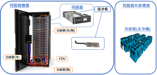 水對水方案則透過加裝流量控制閥、板式熱交換器,以及機櫃外部環境冷卻塔設備,在機櫃內液冷板與分岐管透過管中液體將熱帶出,管中冷卻液體吸收了熱能後,會經過CDU透過循環泵送到冷卻機,帶入冷卻塔後冷卻的液體會流回CDU再分配到機櫃內的分岐管中,繼續吸收熱能,進行液體冷熱交換作為一個循環。