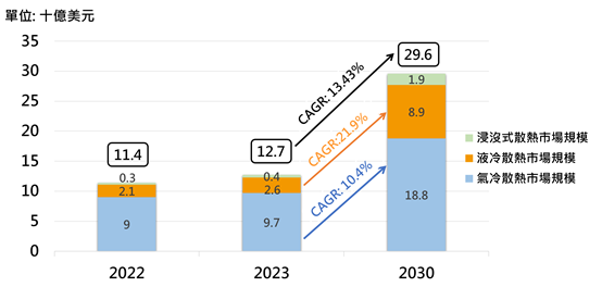 由上可知,高階AI伺服器不斷往高算力與高運算密度發展,將成為液冷散熱巿場的主要成長動能。根據調研機構MarketsandMarkets預測,全球散熱市場規模將從2023年127億美元成長至2030年296億美元,年複合成長率(CAGR)達13.43%。其中,液冷市場規模成長幅度最為明顯,預估從2023年26億美元成長至2030年89億美元,年複合成長率達21.9%。