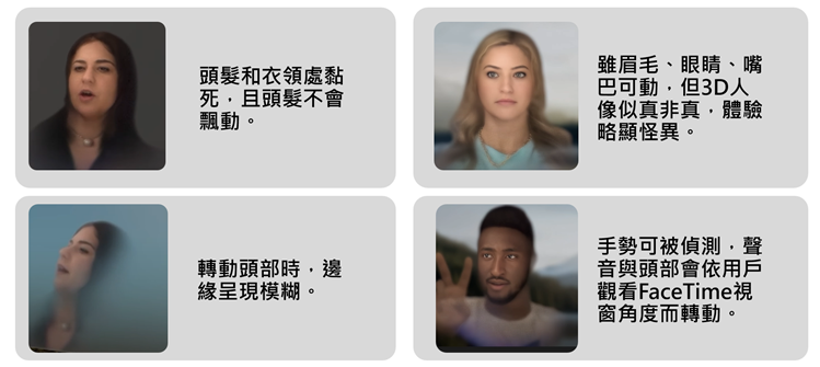 再者,使用者掃描臉部建立的Persona虛擬頭像,3D頭像雖可挑眉、眨眼、微笑、捲舌,臉部動態細節多,但頭髮不會飄動,且會和衣服相黏,當頭部左右晃動時,側面的頭髮也被刻意模糊不顯示,呈現略死板,效果還在恐怖谷(Uncanny Valley)階段。