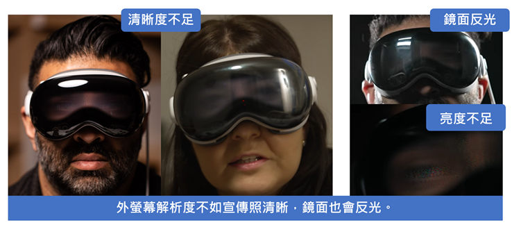 外螢幕透視人臉功能EyeSight在蘋果官方宣傳影片中顯示清晰,然實際體驗並非如此,不僅外螢幕顯示器會反光,顯示解析度也有待加強,要清楚觀看Vision Pro配戴者的表情相當困難。
