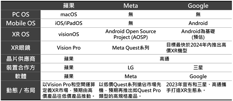 微軟(Microsoft)的Windows、Google的Android、Meta基於Android開源專案(Android Open Source Project;AOSP)開發的XR作業系統,分別僅有PC、手機、XR單一生態系的用戶基數,若以在空間中執行多樣軟體的便利性而言,蘋果因同時具有PC、手機、XR作業系統,或為蘋果競爭XR領域的獨特優勢。