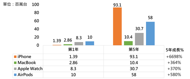 觀察過去蘋果產品iPhone、MacBook、Apple Watch、AirPods自產品第一代上市後,前5年出貨量均成長,第2年出貨量分別成長737%、43%、43%、100%,至第5年出貨量達第1年的67倍、3.6倍、3.7倍、5.8倍,均可看出蘋果優化產品迅速;此外,過去蘋果也在各裝置持續推出如SE、Air、Max、Pro、Ultra、Max等不同版本,滿足不同需求與預算的消費者,增加銷量。