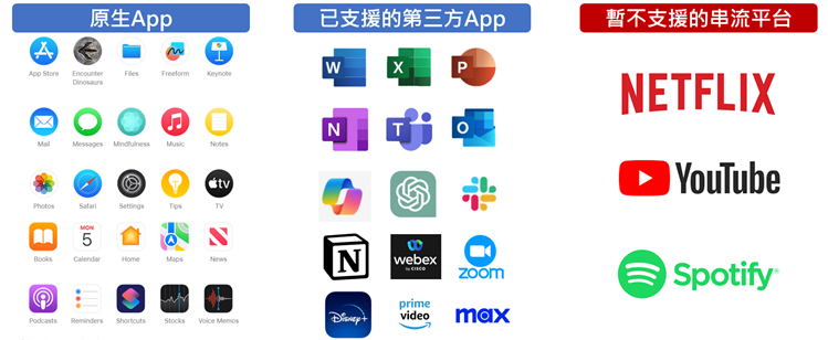 Vision Pro支援的生產力App除蘋果的Keynote外,也支援Microsoft 365的Word、Power Point、Excel,並支援協作軟體Slack、筆記軟體Notion、視訊軟體Webex、Zoom,也支援Open AI的ChatGPT。就生產力而言,Vision Pro已獲多數熱門App支援。
