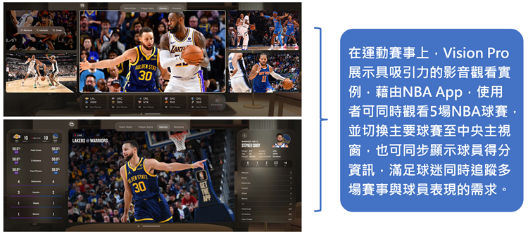 在影音娛樂上,Netflix、YouTube與Spotify三大串流平台暫不推出visionOS專屬App,據The Verge記者體驗,甚至YouTube上的VR影片也無法在Vision Pro上播放;不過,YouTube發言人已表示visionOS的YouTube App已排入產品路線圖,依Vision Pro的熱潮,若非戰略考量,串流平台應遲早會支援Vision Pro。現階段Vision Pro支援使用者基數較大的串流服務為Disney+,訂戶數約1.5億,另外,使用Vision Pro觀看如NBA等體育賽事上,也有不錯的體驗。
