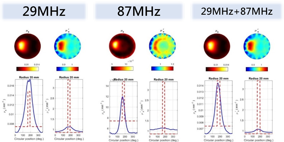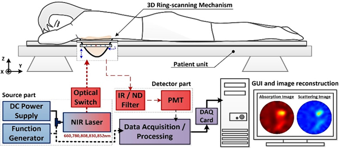 ultrasound等生理組織斷層影像技術,能夠相互競爭或輔助。本技術藉由個生理組織在特定波段近紅外光的光學特性差異,來區分不同組織或判別組織病變。其藉NIR光源入射生理組織,經由掃描組織周圍所偵測到的光功率,反算組織斷層介質的光學係數(如吸收係數、散射係數等),進而判別所掃描橫斷面上生理組織的差異、及診斷惡性腫瘤之發生。