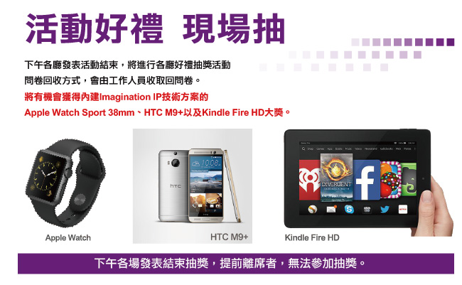 Imagination和合作夥伴將帶來前瞻式的演講內容,幫助您快速理解Imagination的SoC處理器與全新獨特IP架構,如何以高效能、低功耗引領業界。Imagination產品廣泛運用於各類創新產品,涵蓋行動裝置、消費性電子產品、車用電子、物聯網裝置(loT)、儲存裝置、網路、穿戴式裝置,以及其他更多市場領域,現場將有專人為您詳細介紹。