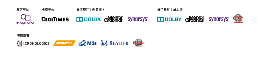 高峰論壇並邀請到重量級大廠台積電、聯發科、瑞昱、Mentor、Synopsys帶來一系列精彩的演講內容,Mentor、Synopsys、台積電、杜比也將於現場展示最新解決方案,協助您推出超低功率與高效能的創新產品。無論您是SoC硬體或軟體設計工程師,或是負責管理SoC設計或軟體團隊,還是出於好奇,想要進一步了解Imagination的SoC技術之所以炙手可熱的原因,千萬不要錯過2015 Imaginationa高峰會,您將不虛此行!