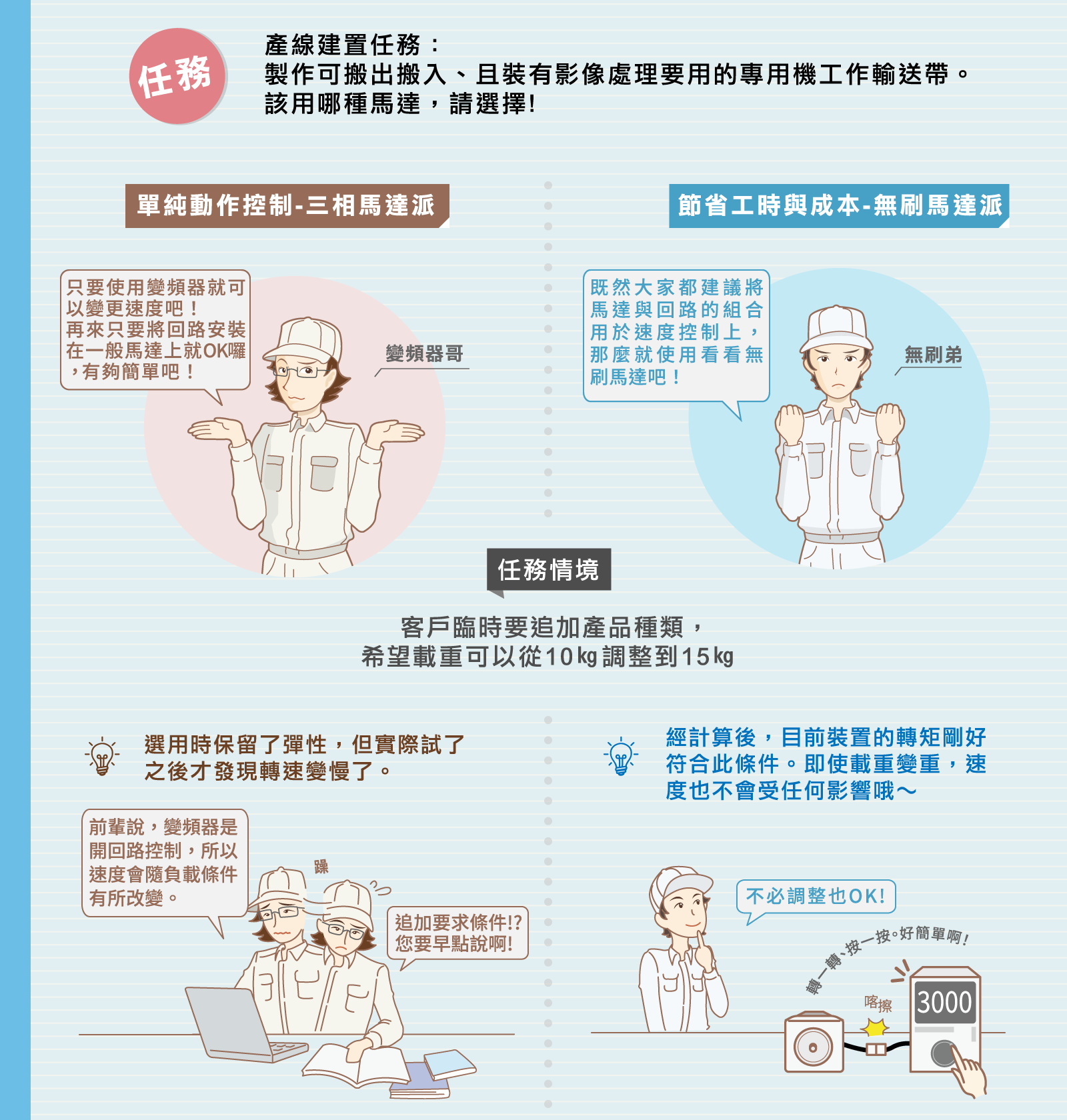 提到小型馬達的速度控制,一般認為只有變頻器驅動的三相馬達和伺服器馬達2個選項,以實際案例來比較看看會遇到的情況吧!