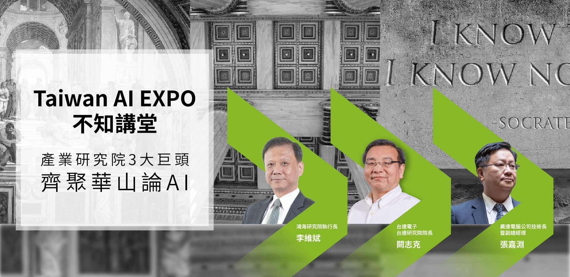 「我知道我一無所知」,來呼應面對浩瀚學問知其不知的謙卑,將有超過 20 位 AI 趨勢大師進行專題演講。