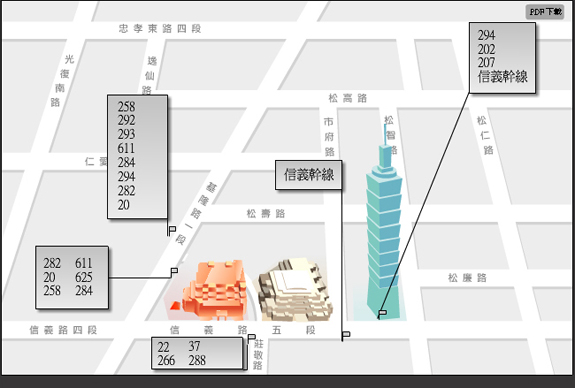 搭乘258、292、293、611、284、 294、282、20、625、22、37、266、288、202、207、信義幹線在世貿中心站下車。