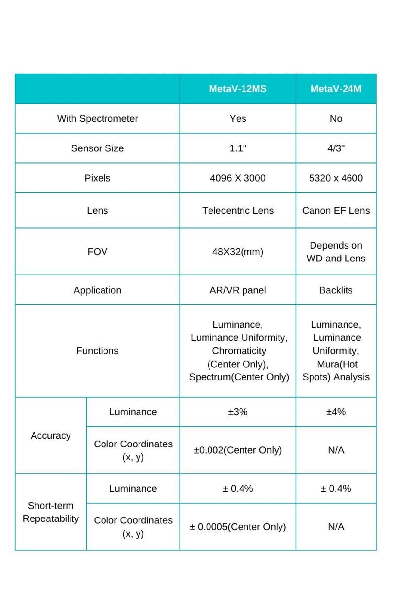台灣超微光學新開發一系列多光譜色彩輝度計MetaV,預計於2023年第2季之後推出。系列產品包含適用於AR/VR面板的MetaV-12MS,採用12MP的Sony 面型感測器搭配遠心鏡,可檢測面板輝度、輝度均勻性、色度與中心區域的光譜。以及適用於背光模組的MetaV-24M輝度計,除輝度量測外,亦可做到Mura分析。