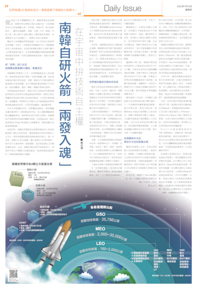 從地面上的半導體製程之爭、電動車電池技術競逐,南韓同時也將眼光望向浩瀚宇宙。日前南韓宣布自主研發運載火箭「世界號」(KSLV-II,Nuri)發射成功,一躍成為俄羅斯、美國、中國、日本、歐盟、印度之後,第七個可以發射1噸以上實用衛星的國家,而南韓晉升為太空強國之...