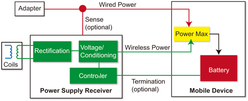 圖2顯示了一個無線充電接收器如何模仿電源轉接器(power supply adapter)的運行,提供行動裝置5-V、5-W電源。在這種最簡單的配置中,接收器和行動裝置之間僅要求兩個觸點、無線電源和接地。由於大多數第一代Qi產品仍保留有線連接器,因此圖2顯示了如何透過一個有線轉接器或者無線電源來充電。兩個電源都連接至行動裝置內部的電源複用器 (power multiplexer)。一般而言,轉接器電源是默認選擇,而在沒有轉接器的情況下才使用無線電源。