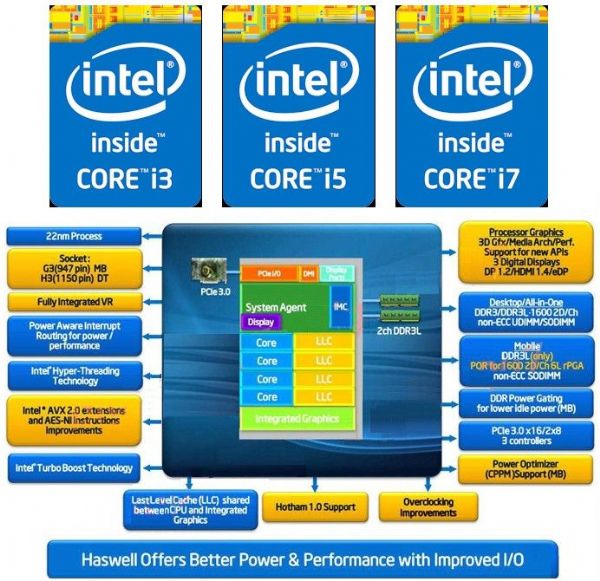 桌電版本的Corei3/5/7-4xxx系列設計功耗從35?84W,全部採用LGA1150插槽╱腳位設計,跟前一代Sandy-Brideg/IvyBridge的LGA1155插槽╱腳位並不相容,僅散熱器扣具能夠轉移;Haswell處理器對電源供應器的待機節電規範上也更趨嚴苛,因此若要選購支援Haswell處理器的電腦平台,從處理器、主機板(晶片組平台)都要重新選購,電源供應器部份則需先向廠商確認,出廠前有做過Haswell處理器的相容認證。