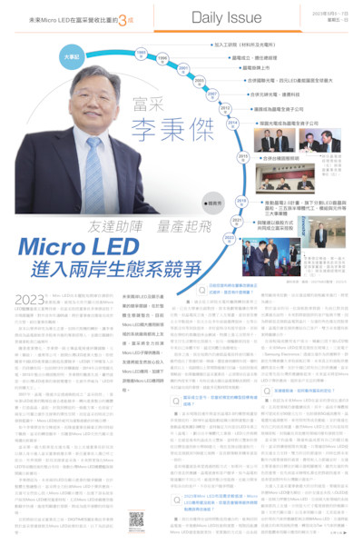 由於車廠客戶對於產品驗證的要求很高,因此客戶也希望Micro LED在消費性產品的驗證量產動作加快,雖然2023年Micro LED對富采營收貢獻仍然很小,預計等到新廠完成導入量產後才有較顯著動能,但我們在意的是電視和汽車需求,畢竟智慧手錶的量並不大,有了富采支持,友達就更能放心投入新案開發。