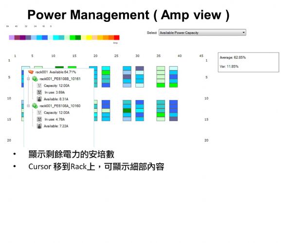 透過ATEN eco Sensors中的DCIM模組即可依照目前機房的使用狀況及新的需求,進行模擬運算,提出有效的建議安裝方案及安裝後的相關效率指標。有了這樣一個強而有力DCIM管理工具,數據機房針對新增的業務需求及所需的額外投資,可做進一步的投資效益評估,提供高階經理人一個有用的決策工具。