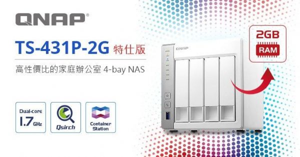 威聯通科技(QNAP Systems, Inc.)針對高性價比TS-x31P NAS系列推出TS-431P特仕版機種,採用高效節能AnnapurnaLabs、an Amazon company Alpine AL-212雙核心1.7 GHz處理器,記憶體升級為2GB,可支援Qsirch(酷先生)全文檢索搜尋工具,以及軟體容器應用、雲端筆記、郵件收發總代理等豐富功能,滿足家庭、小型辦公室和個人工作者檔案儲存、備份與分享等多樣需求。