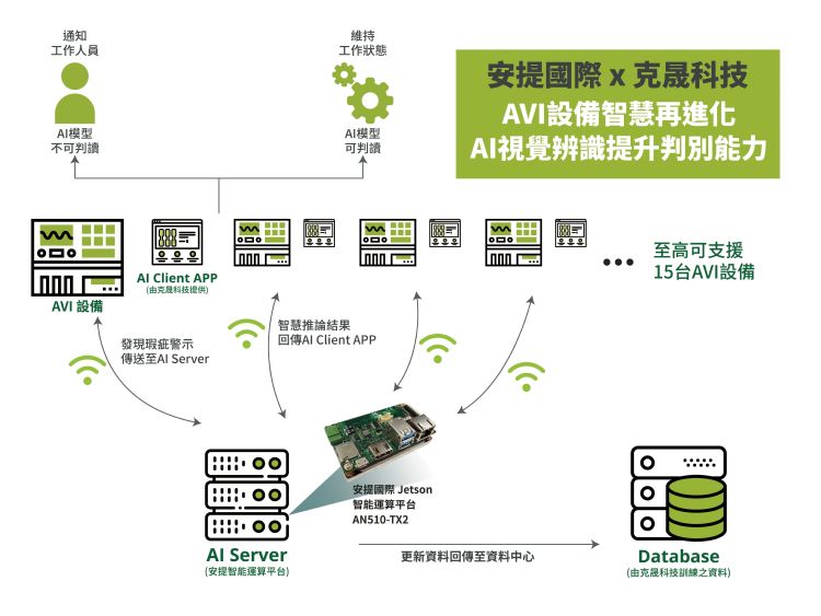 整體系統中,其高效能AI伺服器使用安提國際Jetson AI運算平台;由Nvidia Jetson TX2搭載安提板卡ACE-N510組成,擁有高達256個CUDA核心、1.3 TFLOPS的AI推論能力,提供AI伺服器所需之效能處理,且具備極小型化的特色,便於部署於既有工廠設備,不僅達成輕鬆AI升級的解決方案,也適用於AI邊緣運算的裝置使用;搭配克晟科技辨識演算法,一次可對應15台AVI設備並同時檢驗八種瑕疵項目,將既有設備的檢測準確率提升90%以上,免去繁複且多餘的人工複檢,有效降低人力成本、提升產線的效率與產量。