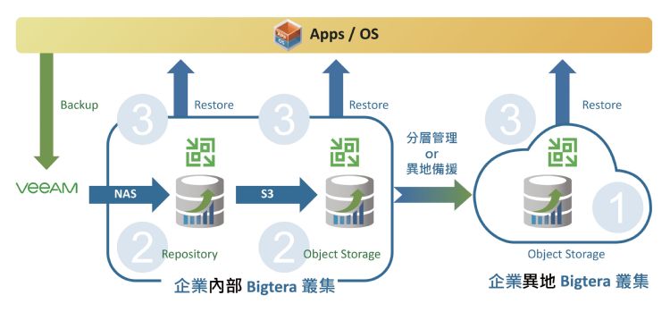 Veeam的資料備份管理與精準還原等的細緻檔案操作,只需將備份目的端指向Bigtera儲存系統,即可協助客戶完成多份資料的保護,且透過Bigtera的遠端備份功能,將資料定期同步到異地,以單一平台輕鬆完成「備份3-2-1」程序,當災難發生時,從任一份備份資料都可以快速還原完整虛擬機器、精準檔案與資料。此外 Bigtera 的版本控管功能還可以擷取、恢復儲存貯體中每一物件的各個版本,企業可藉由功能輕鬆地復原被惡意竄改後的檔案,強化備份資料保護能力。