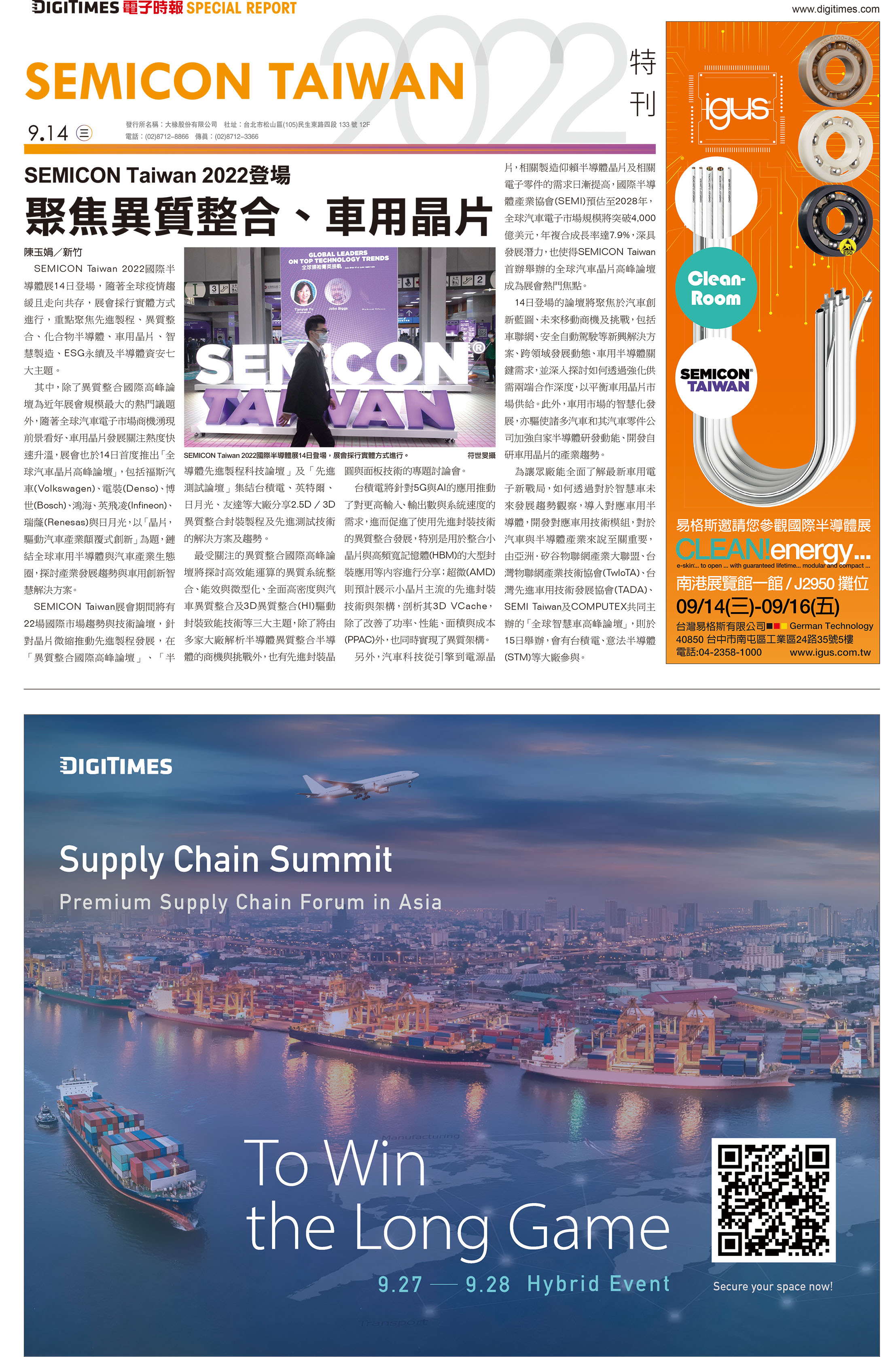 igus 亮相 2022 國際半導體展,助力產業提升整體設備效率(2022/09/14)