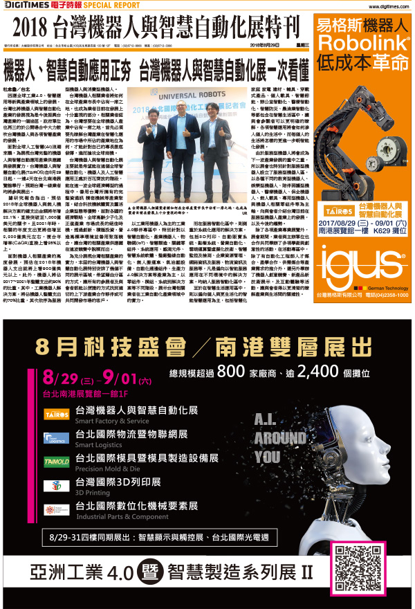 因應全球工業4.0、智慧應用等新興產業領域上的發展,台灣也將機器人與智慧自動化產業的發展視為是今後振興台灣產業的一個途徑,政府單位也再三的於公開場合中大力鼓吹台灣機器人與各項智慧產業的發展。面對全球人工智慧(AI)浪潮來襲,為展現台灣完整的機器人與智慧自動應用產業供應鏈與發展實力,台灣機器人與智慧自動化展(TAIROS)自8月29日起,一連4天在台北南港展覽館舉行,預期台灣一線業者均將參與展出。據研究報告指出,預估2018年全球機器人與無人機解決方案的總支出金額將年增22.1%,直接突破至1,000億美元的關卡。且2021年時,相關的年度支出更將