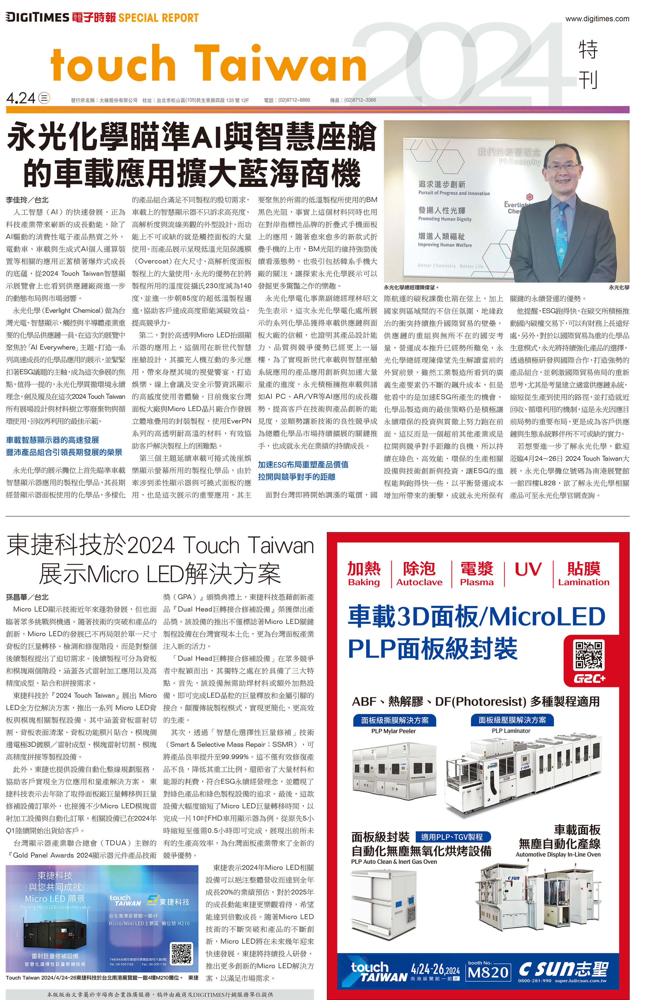 志聖工業(2467)、均豪精密(5443)、均華精密(6640)共同在4月24~26日南港展覽館4樓M區820攤位聯合於Touch Taiwan系列展展出。隨著Touch Taiwan先進設備專區的參展商逐漸增多,2024先進設備專區將擴大為「電子生產製造設備展」,在2024年首度亮相,與SMART+智慧製造展同檔期展出。